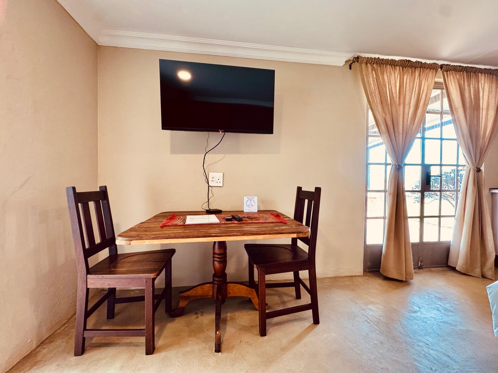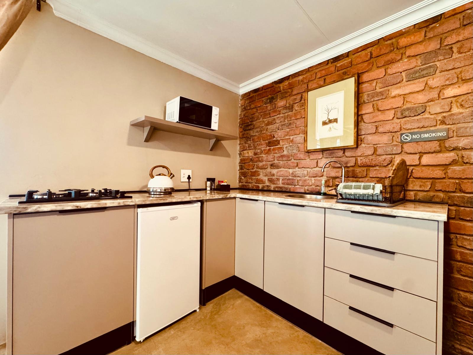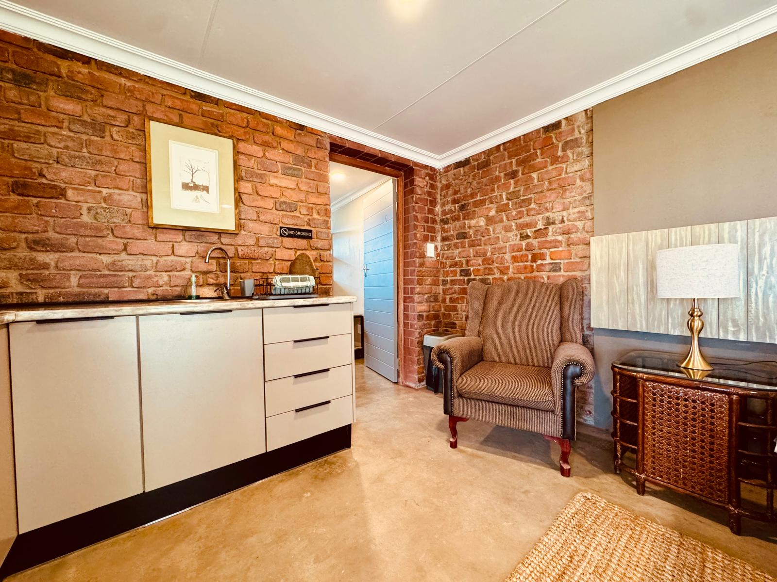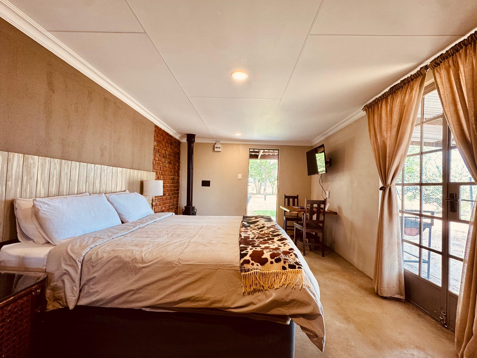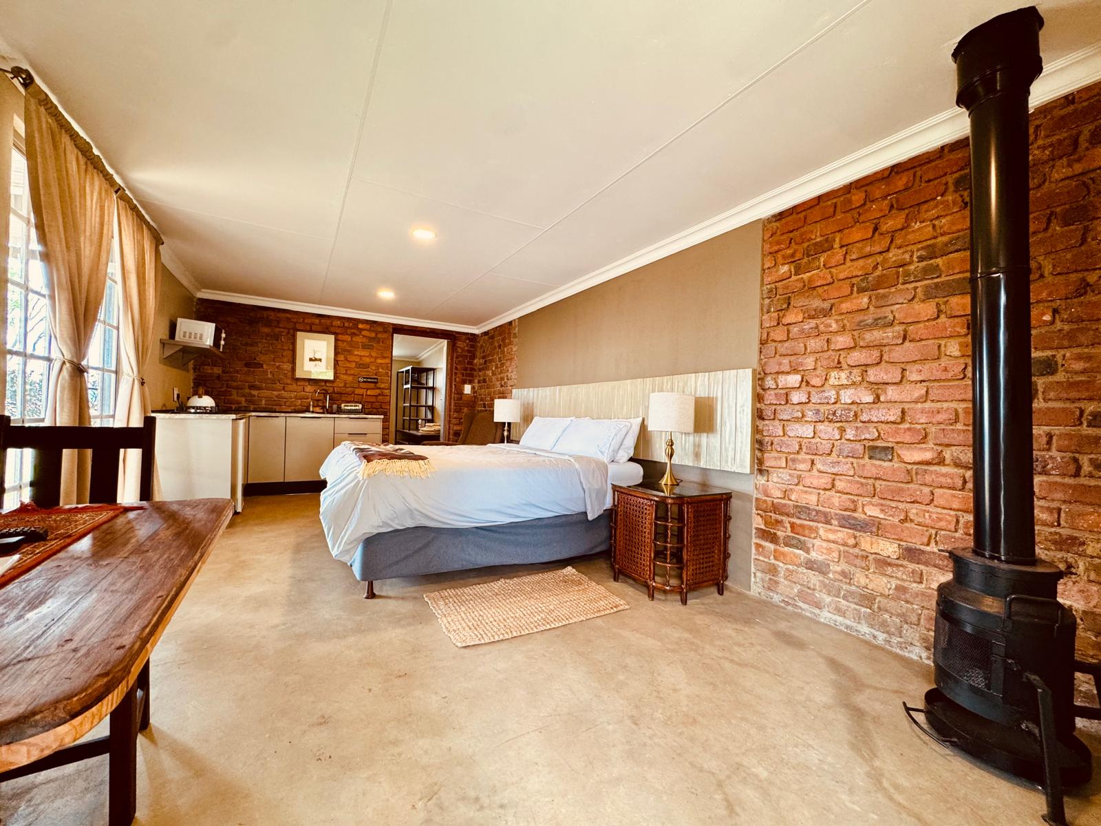 Spacious double suite, with twin beds (side-by-side) (King Size). It features a TV with satellite, Wi-Fi, a kitchenette, fireplace for winter months, and small seated patio with its own braai.