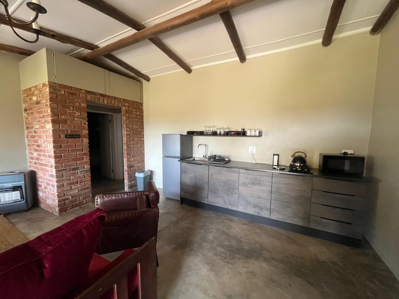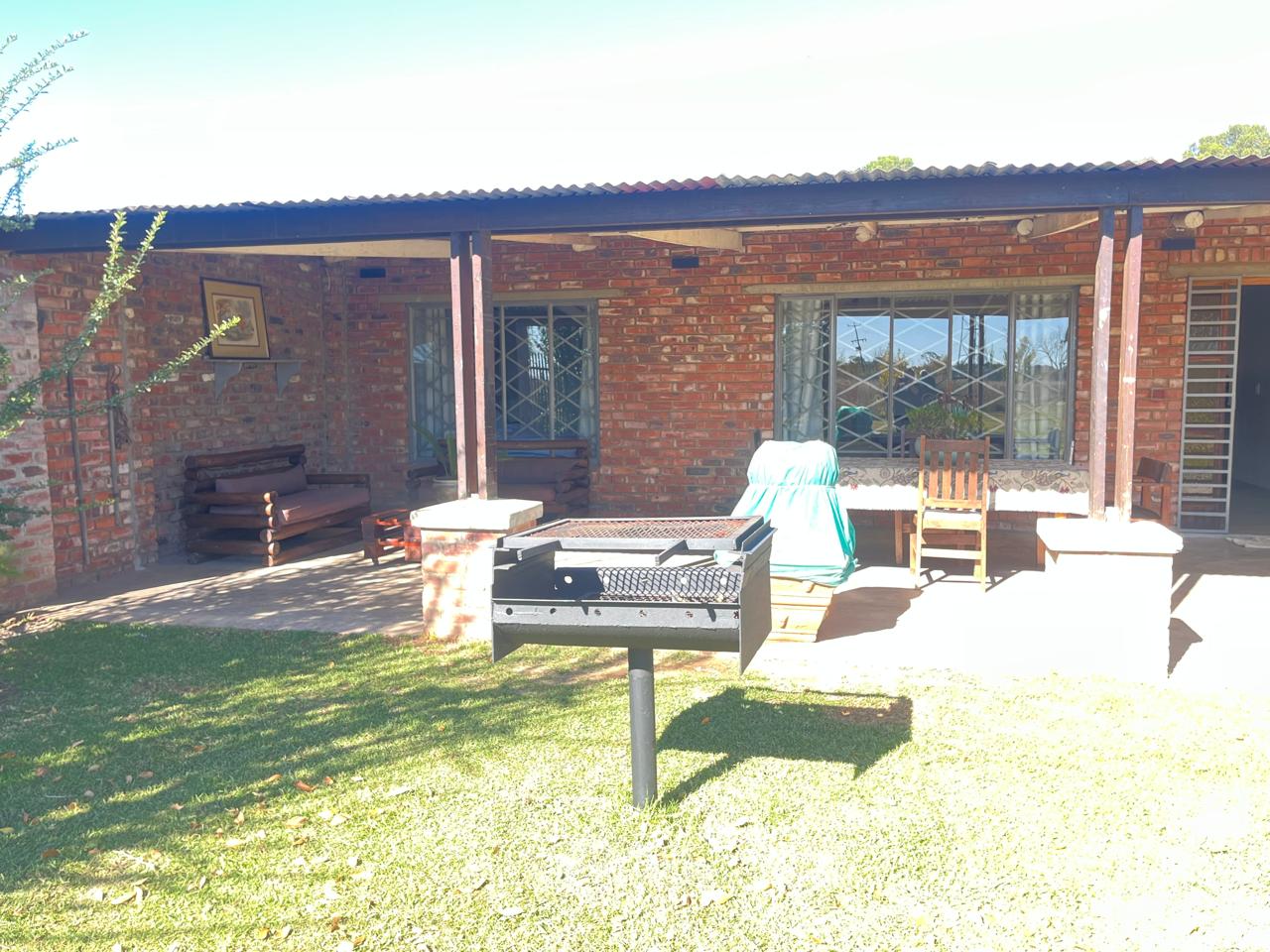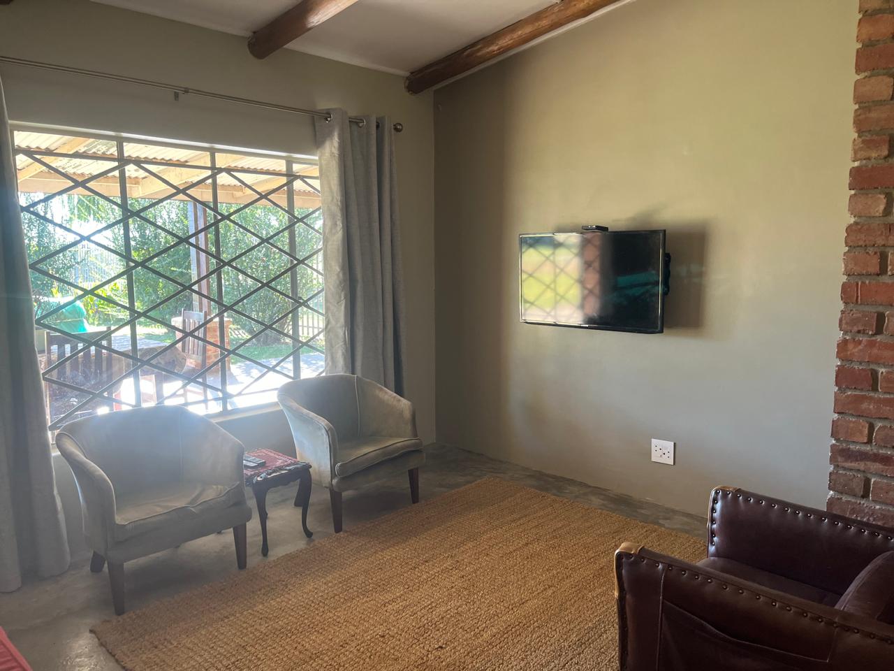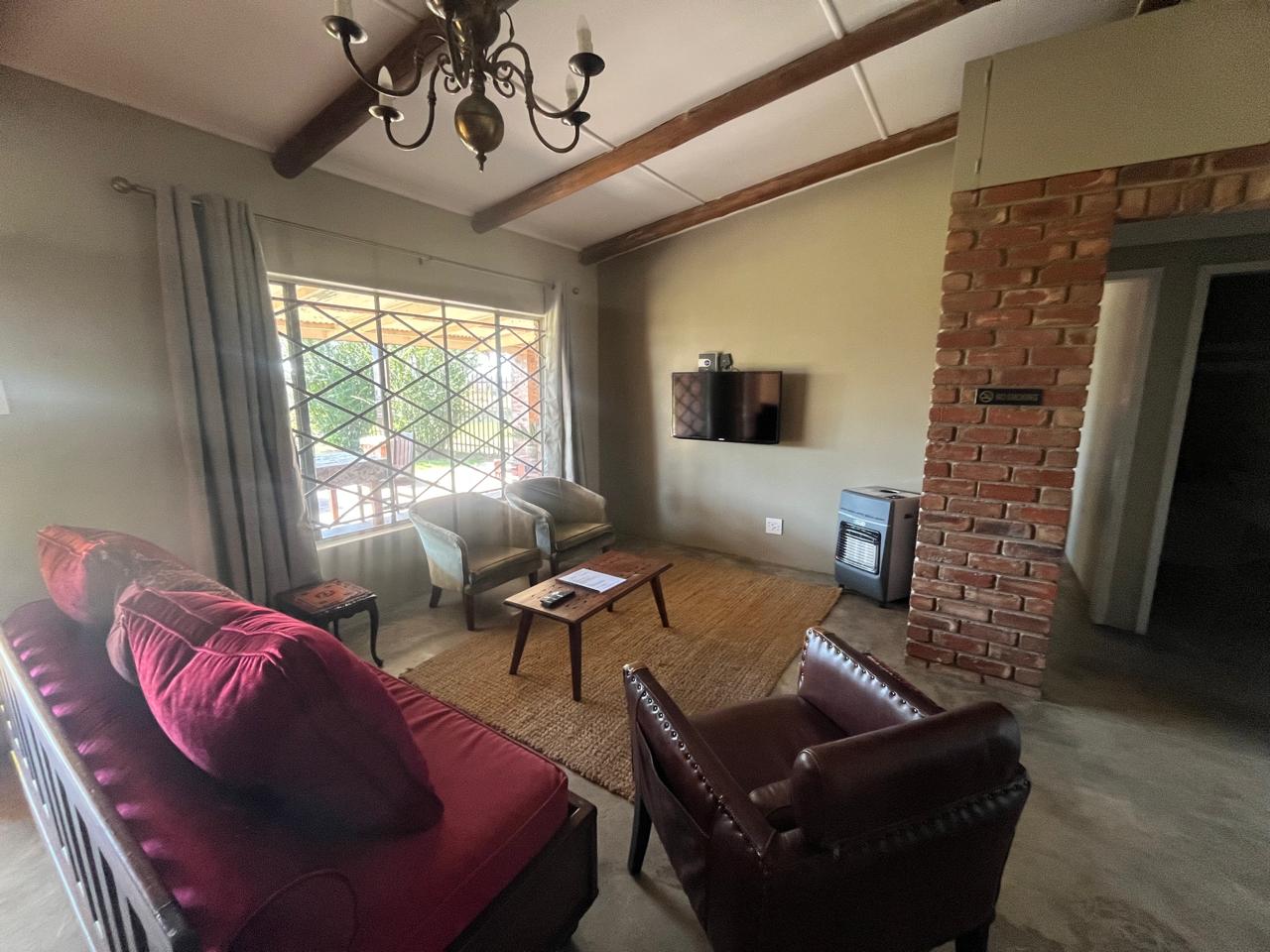 It features a TV with satellite, Wi-Fi, a kitchenette, gas heaters, fans, and a large patio with braai facilities and dining area.