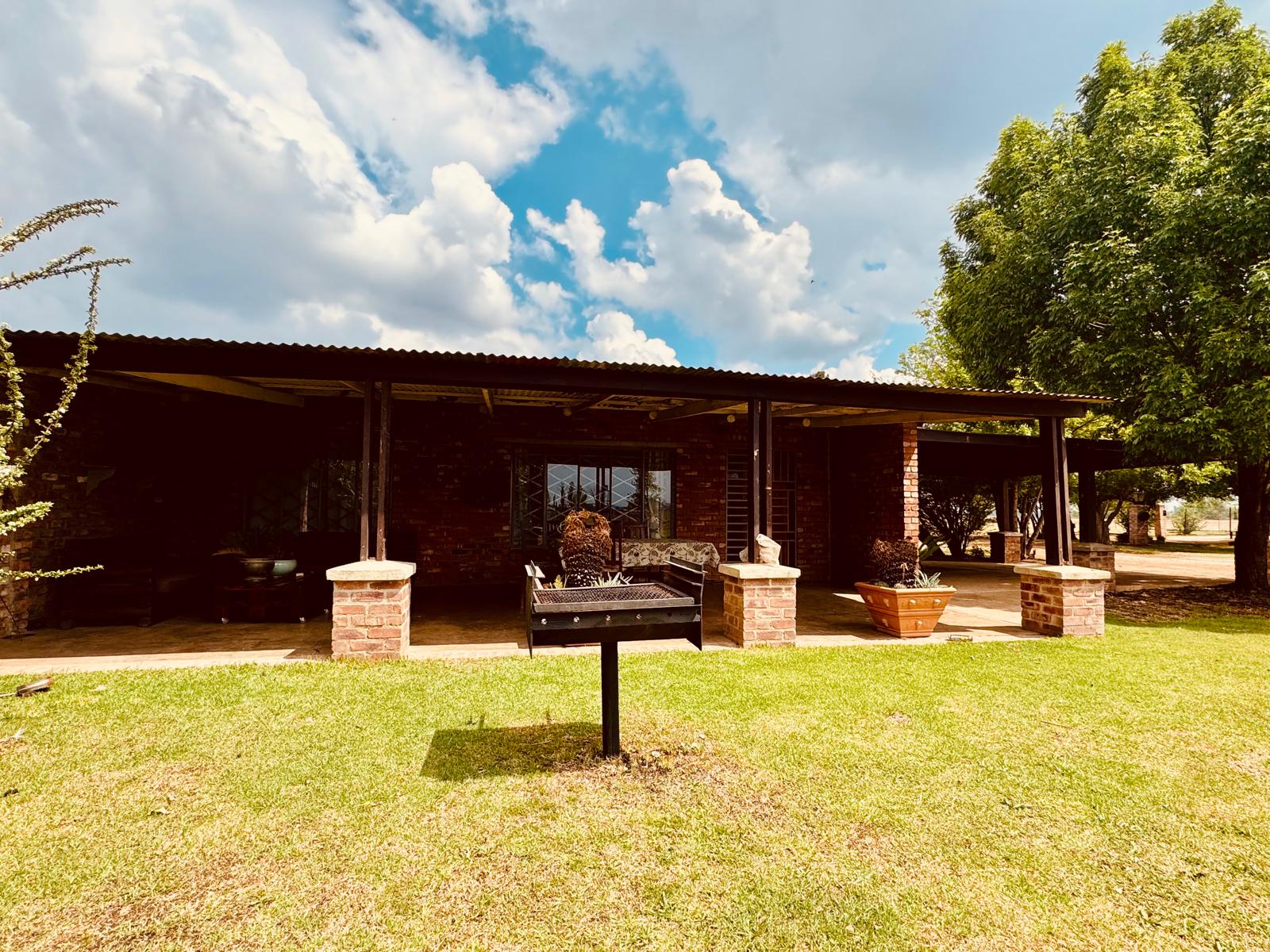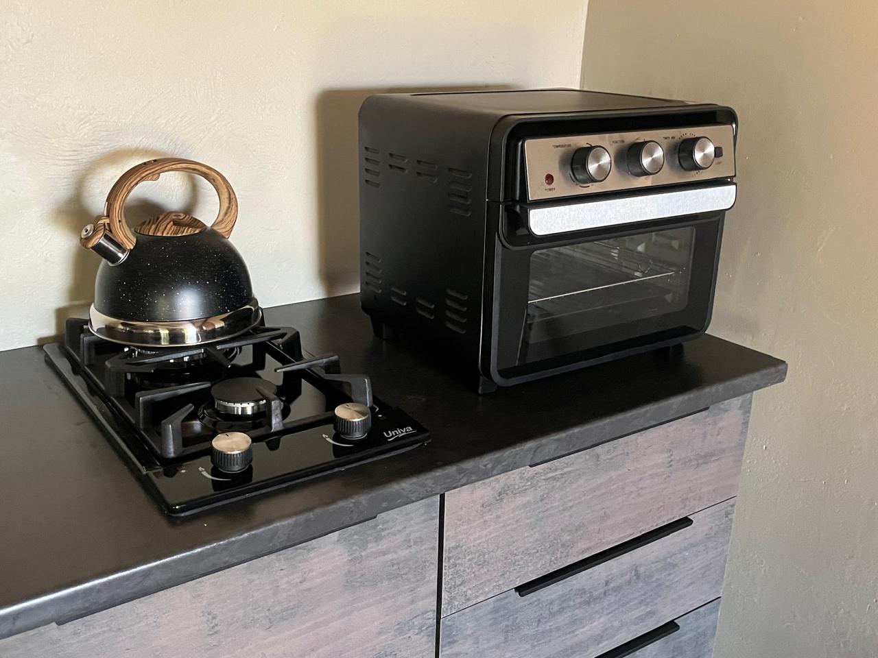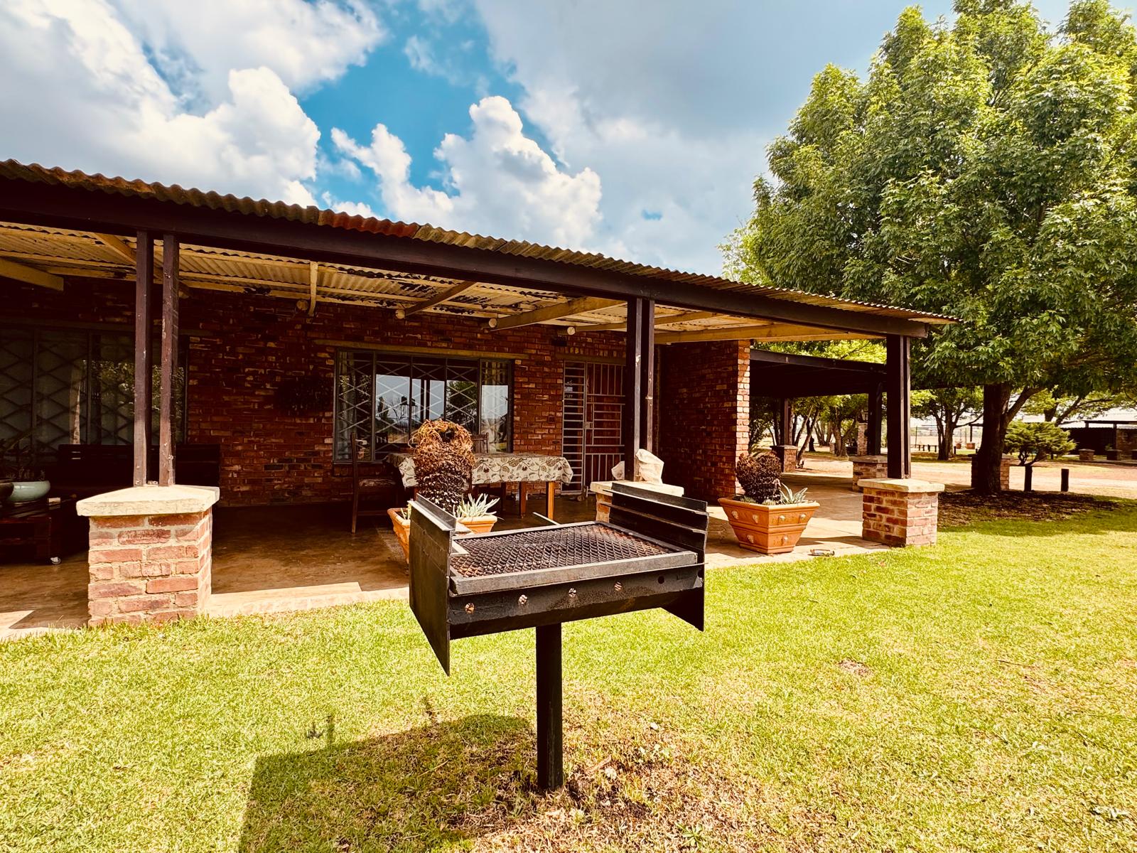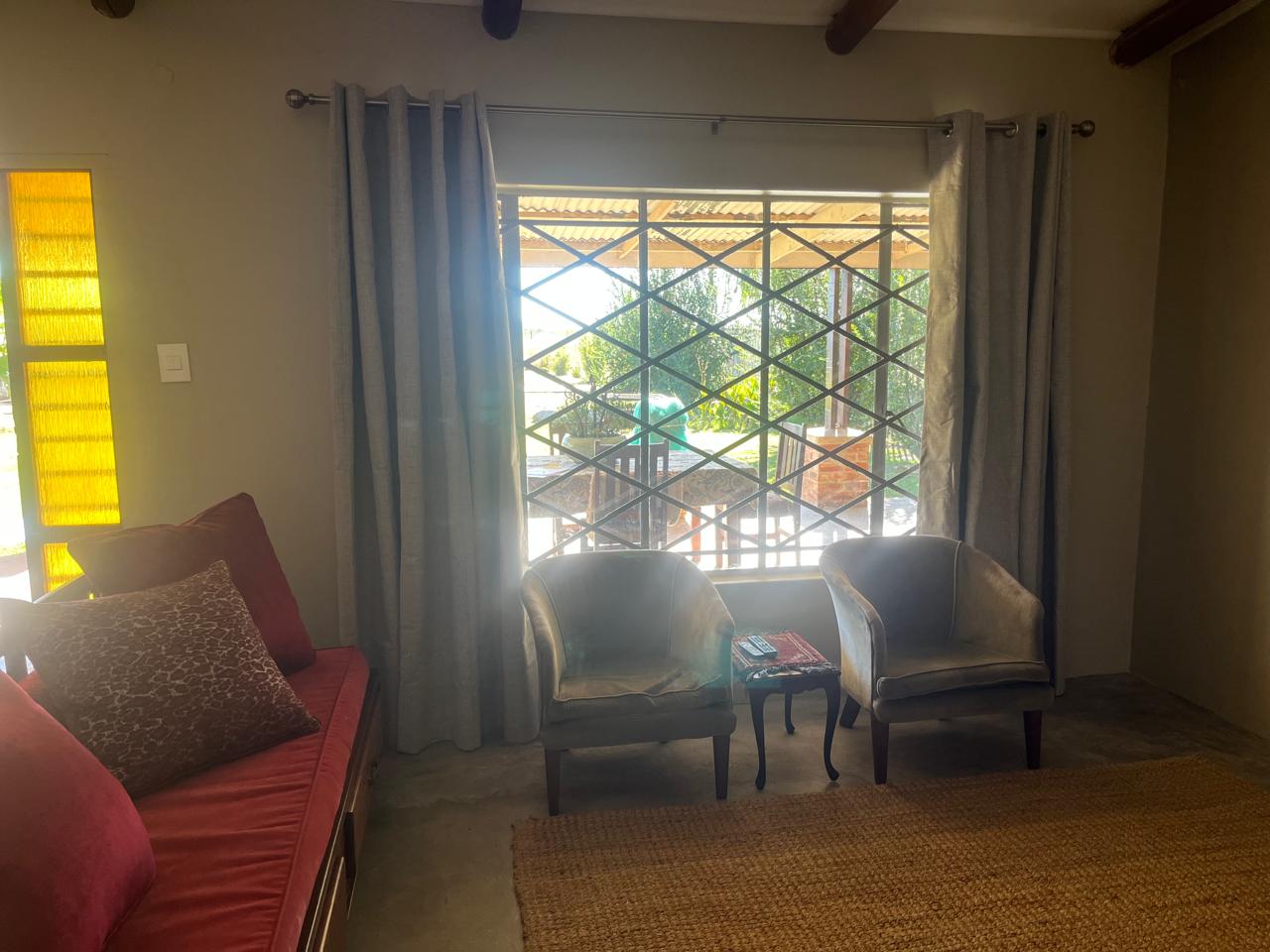 It features a TV with satellite, Wi-Fi, a kitchenette, gas heaters, fans, and a large patio with braai facilities and dining area.